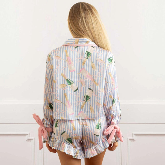 Indulge in the ultimate in nighttime luxury with our woven satin pajama set, thoughtfully designed to combine elegance, comfort, and playful detail. The set features a button-down long sleeve top, exquisitely adorned with velvet bows on the cuffs, adding a touch of refined charm to your loungewear. Paired with ruffle-trimmed drawstring waist shorts, complete with a self-tie velvet bow at the waist, this set balances sophistication with whimsical femininity.